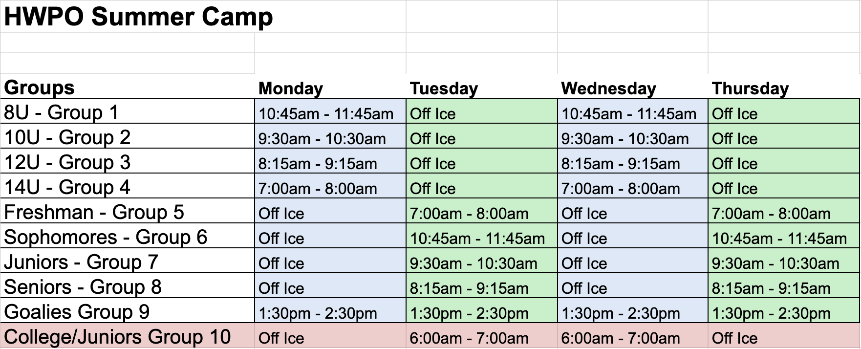 All on-ice and off-ice sessions are 1 hour long, totaling 24 sessions over the course of the six week camp.