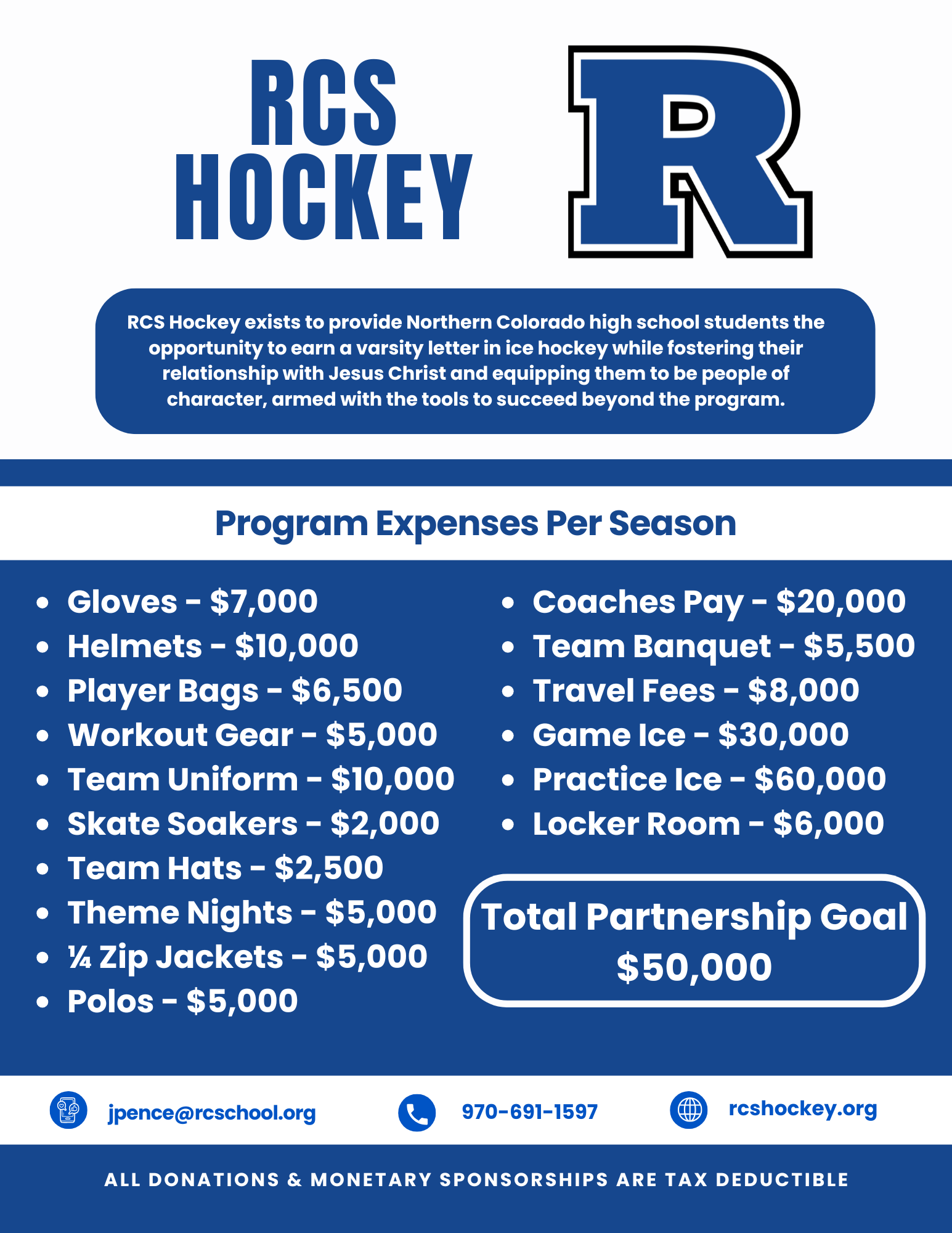 Thank you to all our wonderful sponsors! RCS Hockey could not exist without the support of great local businesses. These sponsors have committed to helping us develop the next generation of community members, and for that we are forever grateful. If you'd like to become a sponsor, email our General Manager, Cal Miller, at cmiller@rcschool.org.